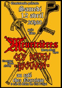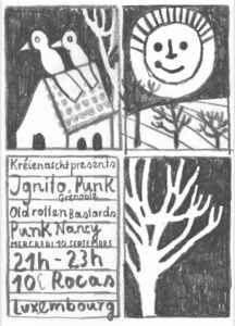 24/03/17 Nancy Secret Place « concert de soutien au lokal 3 », avec 10 groupes dont Deathwatch, Lavement, Geranium, Silence, les Conférence Bunker, Johnny tamoul, Sebum XS… et une reformation pour une date unique de Richard Durn (pas d’affiche)